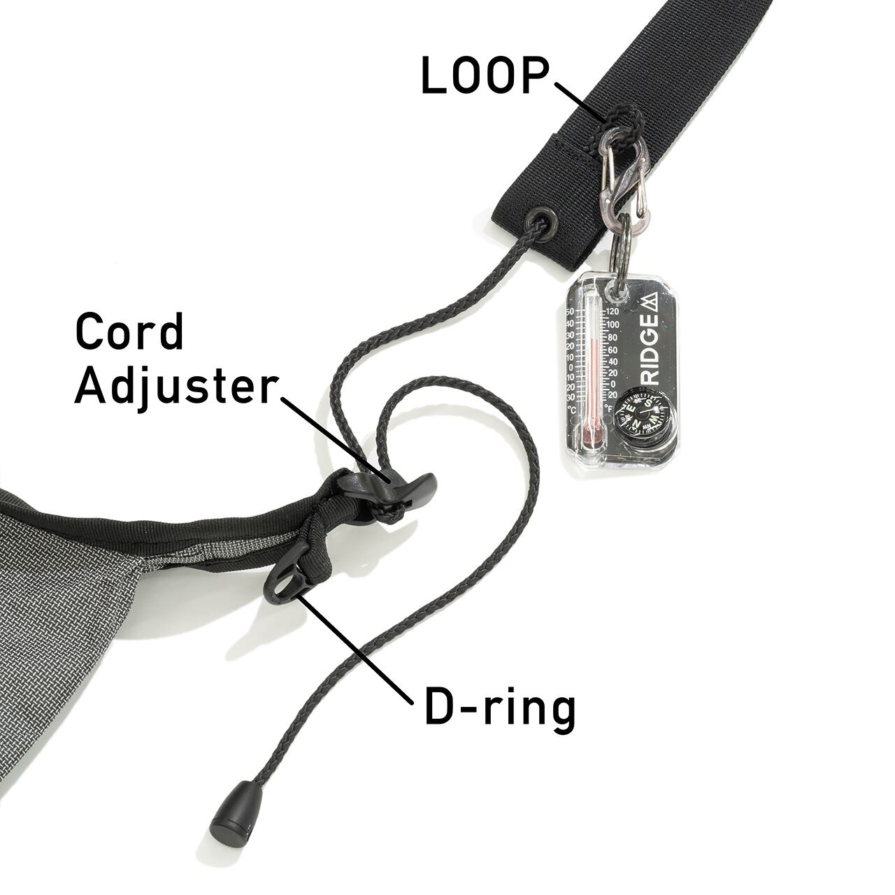 また、コードアジャスターのすぐ下にもDリングを配置しています。こちらもカラビナやコードリールなどを用いて、鍵や小型のLEDライト等を引っ掛けることが可能です。