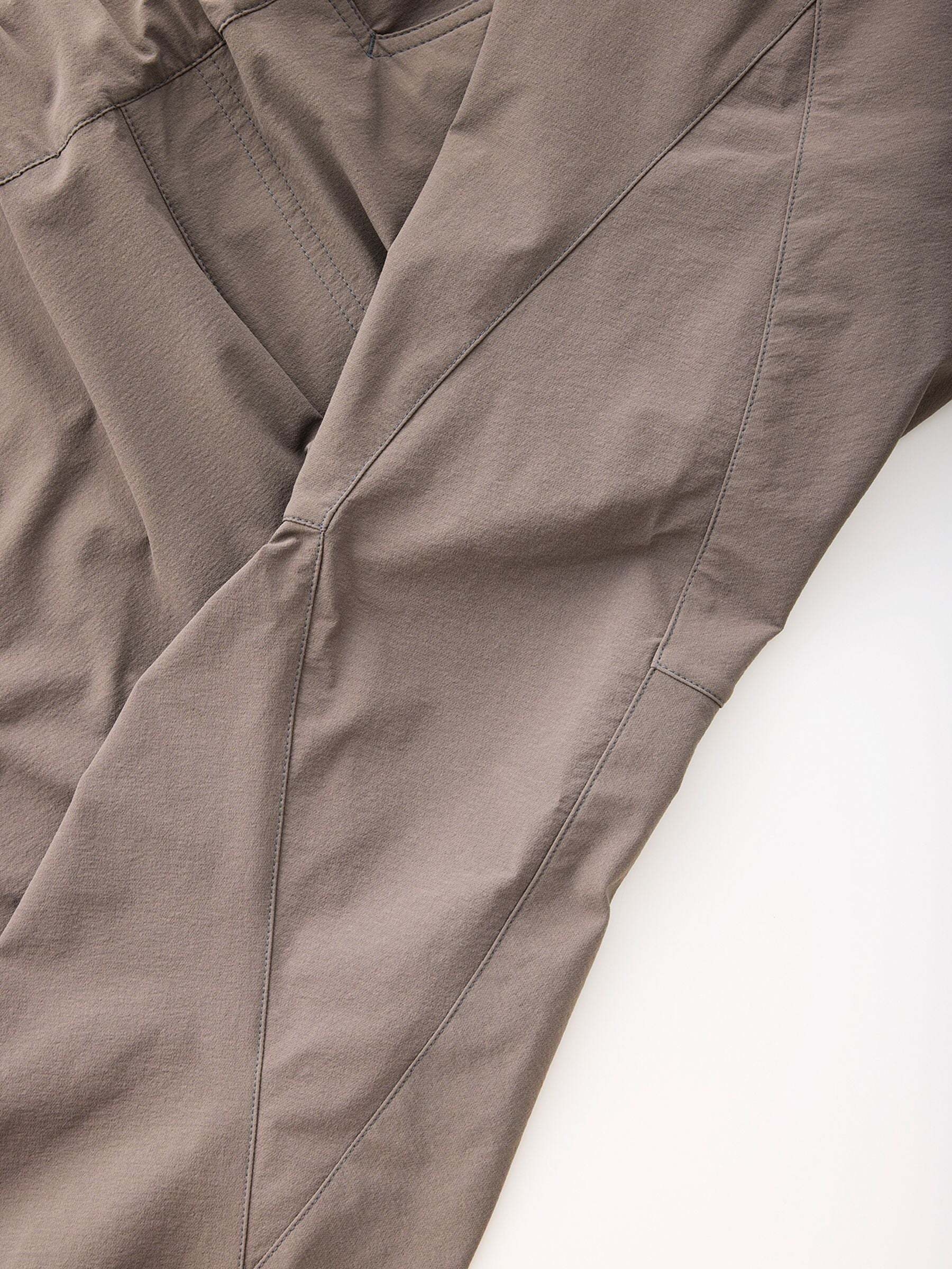 最大の特長はスパイラル形状の膝の立体裁断で、脚を動かしても縫い目が膝に当たらず、なおかつ股下にはガゼットを設けているため足上げはスムーズ。長期の縦走登山でも、脚にかかるストレスを軽減します。