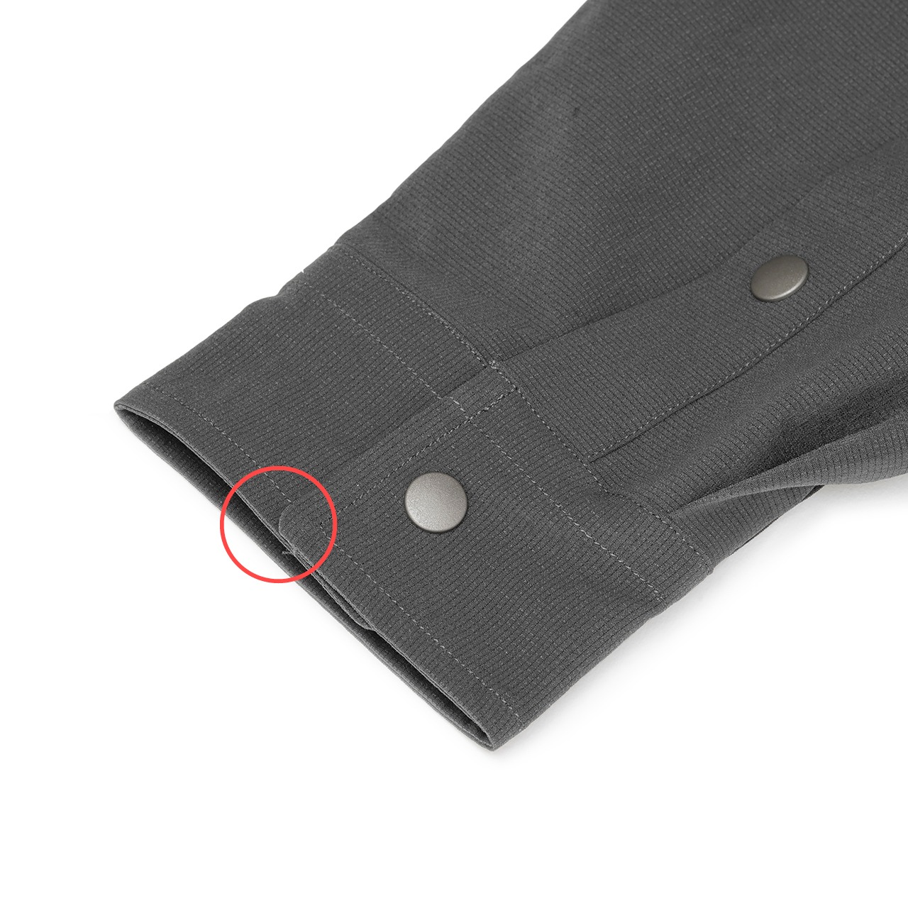 ボタンは全て樹脂製のスナップボタン(YKK PLANCER®)を採用しています。通常の縫い付けボタンの様な糸切れによるボタン紛失の心配がありません。