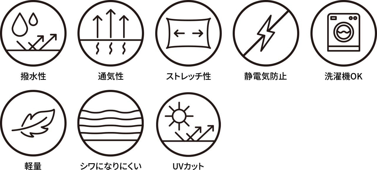 ハイキング時に重要となる濡れてもすぐ乾くといった速乾機能はもう当たり前となっていますが勿論この生地も兼ね備えています。それに加え紫外線防止機能も兼ね備えています。