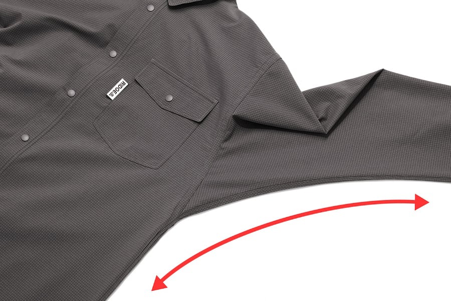 収縮率が異なる2種類の特殊ストレッチ糸を使用して360°全方向に対する高いストレッチ性を実現しています。104g/㎡と軽さは勿論ですが高い防シワ性を実現しています。バックパックのポケットなどに押し込んでくしゃくしゃなった状態でもすぐに形状を回復します。