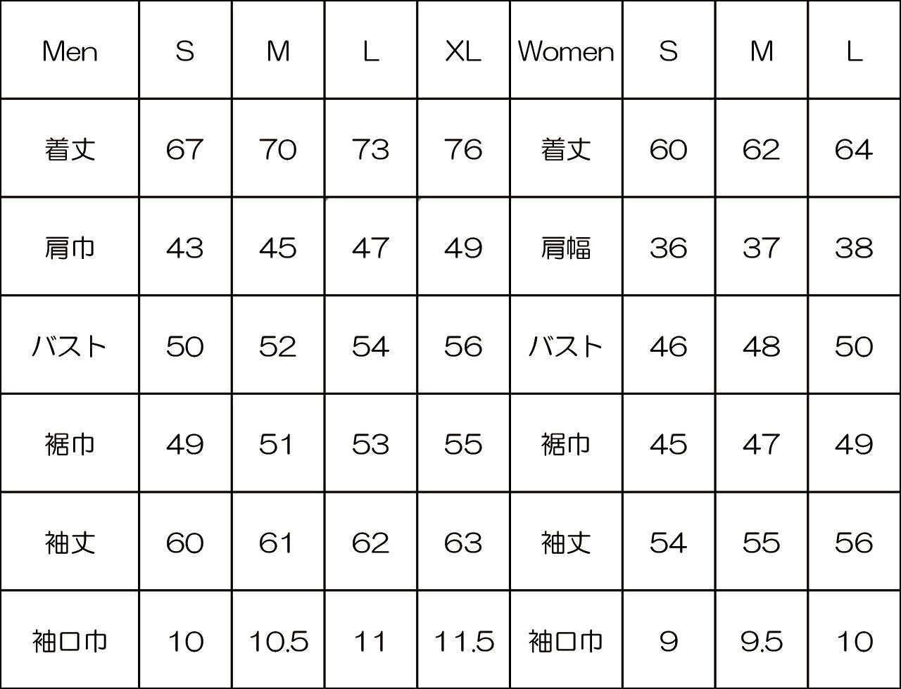 全体的なシルエットは男性用サイズ(Men)と女性用サイズ(Women)共に大きな違いはありませんが、女性用サイズ(Women)は着丈、肩幅など、より女性の体型に合わせたシルエットとなっています。