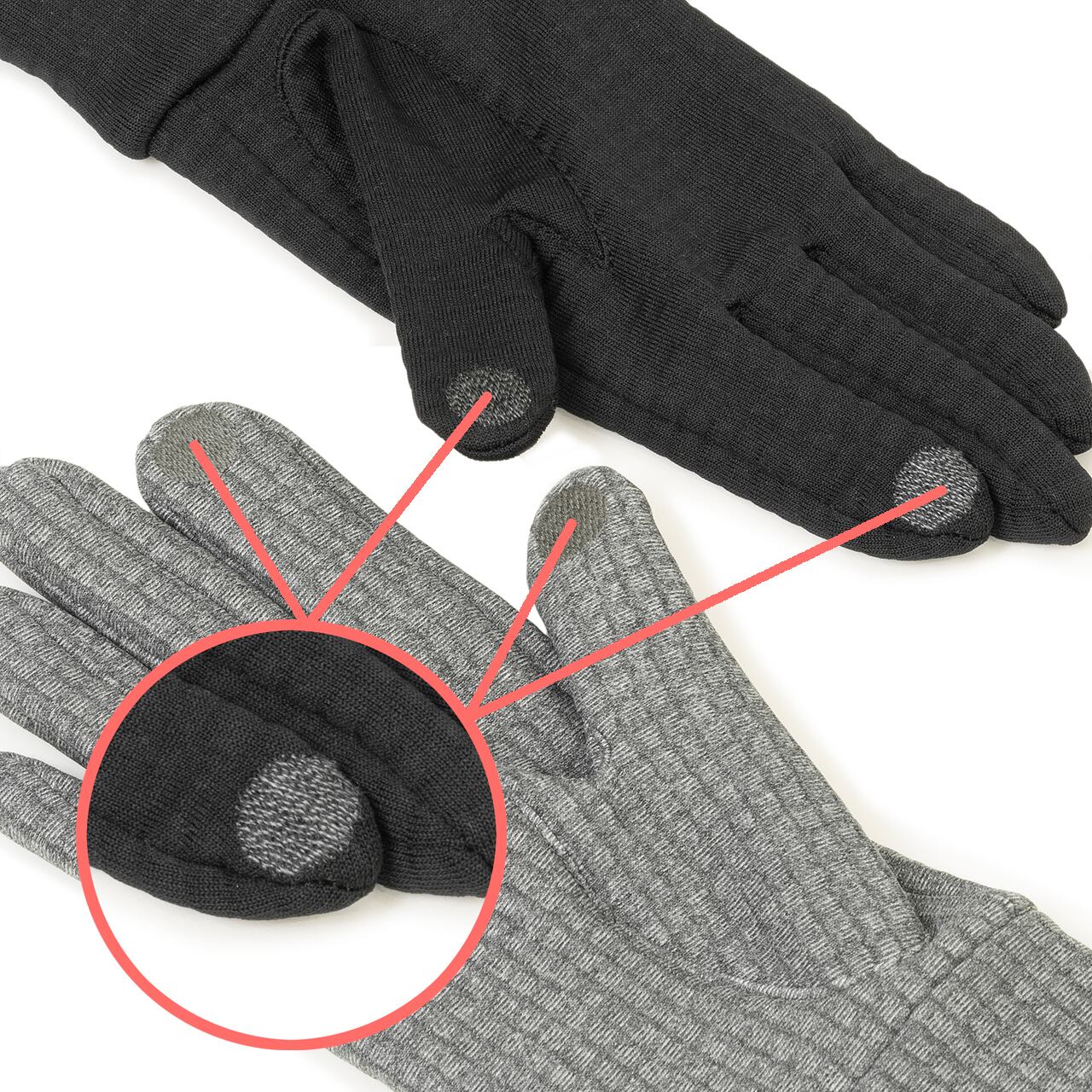 左右の親指と人差し指の先部分には導電性の糸で刺繍が施してあります。